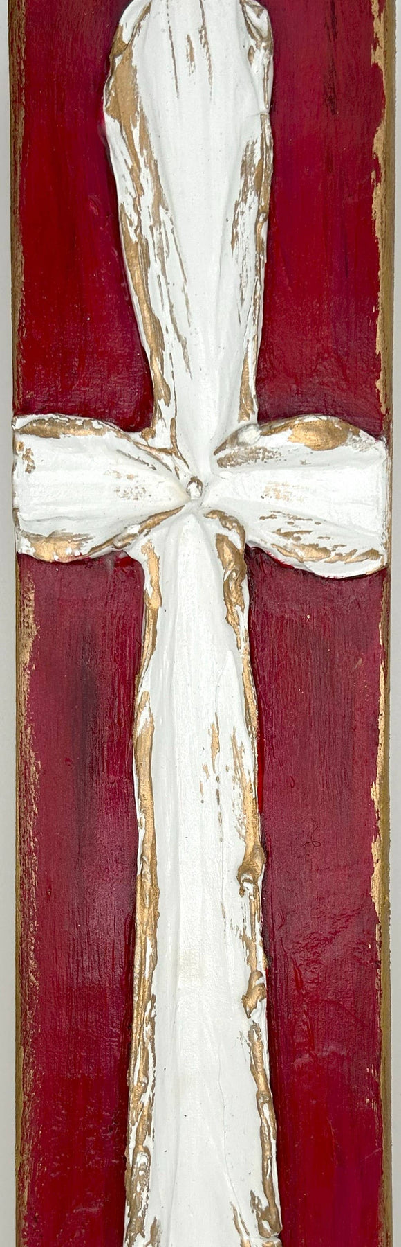 This elegant cross is beautifully hand painted and textured on a thick, self-standing 3x10 wood block. Choose a white, sage, emerald, cranberry, blush pink, or powder blue background.