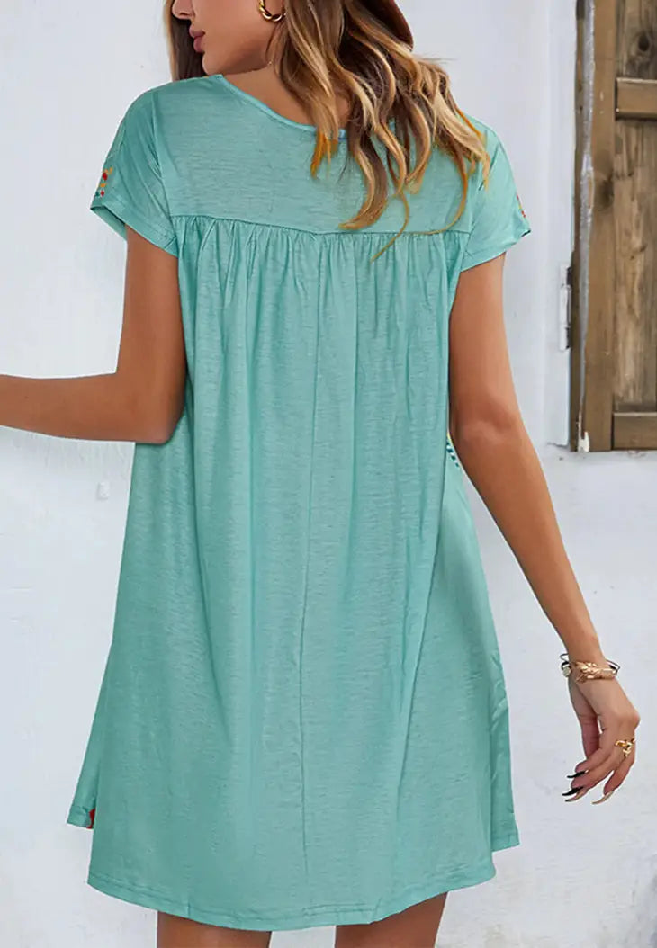 Features a round neck line with short sleeves with a shift dress silhouette at an above knee length.
