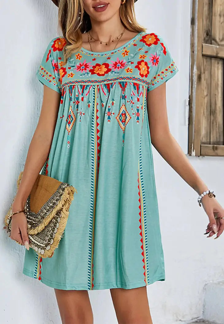 This dress is detailed with a fabulous multi-colored floral Boho print